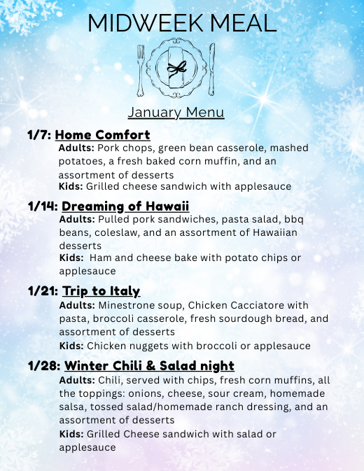 We invite you to gather with us each week on Wednesday evenings beginning in January for a time of food and fellowship in the Wade campus gym, followed by our regular midweek ministries for all ages. Meal cost is $7 per adult plate and $3 per child (through 6th grade). If your family’s total will exceed $20, please select the Family Meal option when registering and complete the meal detail questions. Registration and payment may be completed online using the links below, or by check or exact cash using the envelopes available at the Hub. Please place payments in the drop box outside the church secretary’s door. Registration and payment must be completed by the Sunday prior to each meal. You can register for multiple dates at one time. NO refunds.