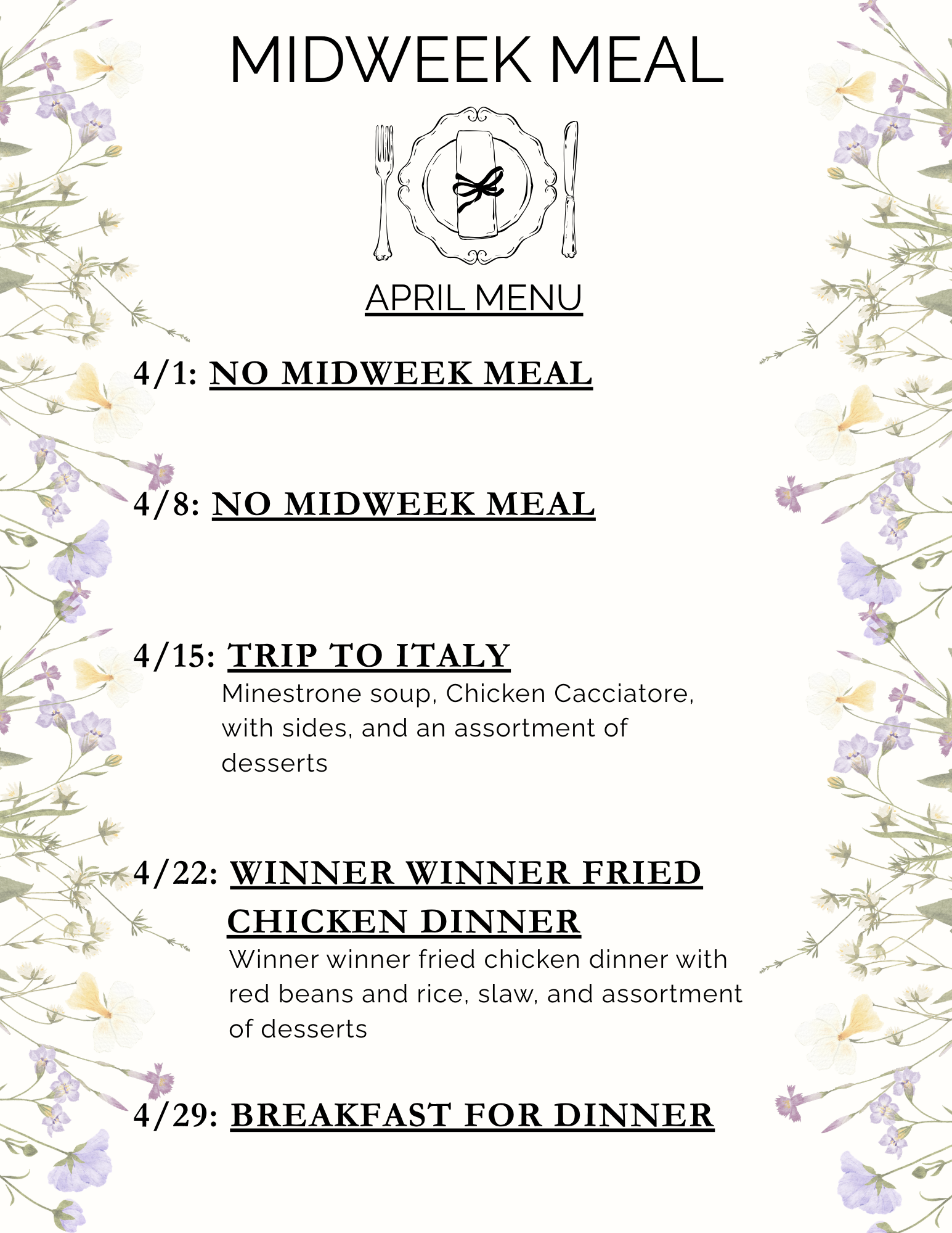 We invite you to gather with us on Wednesday evenings (5 – 6:15 pm) for a time of food and fellowship in the Wade campus gym, followed by our regular midweek ministries for all ages. Meal cost is $7 per adult plate and $3 per child (through 6th grade). If your family’s total will exceed $20, please select the Family Meal option when registering and complete the meal detail questions. Registration and payment may be completed online using the links below or by check or exact cash using the envelopes available at the Hub. Please place payments in the drop box outside the church secretary’s door. Registration and payment must be completed by the MONDAY prior to each meal. You can register for multiple dates at one time. NO refunds. Please be sure to choose the correct meal date(s) for online registration and/or on the payment envelope.